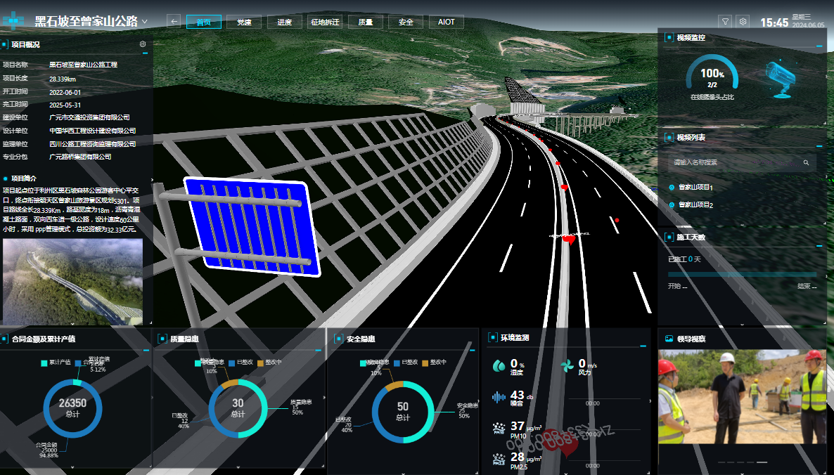 为强化危害管控,黑曾路项目部引入智慧信息化可视治理平台,综合运用BIM、GIS、物联网、大数据、人工智能、无人机等先进技术,构建基于BIM+GIS+IOT+AI+PM的智慧工地平台,实现进度、质量、宁静等全方位智能化管控。