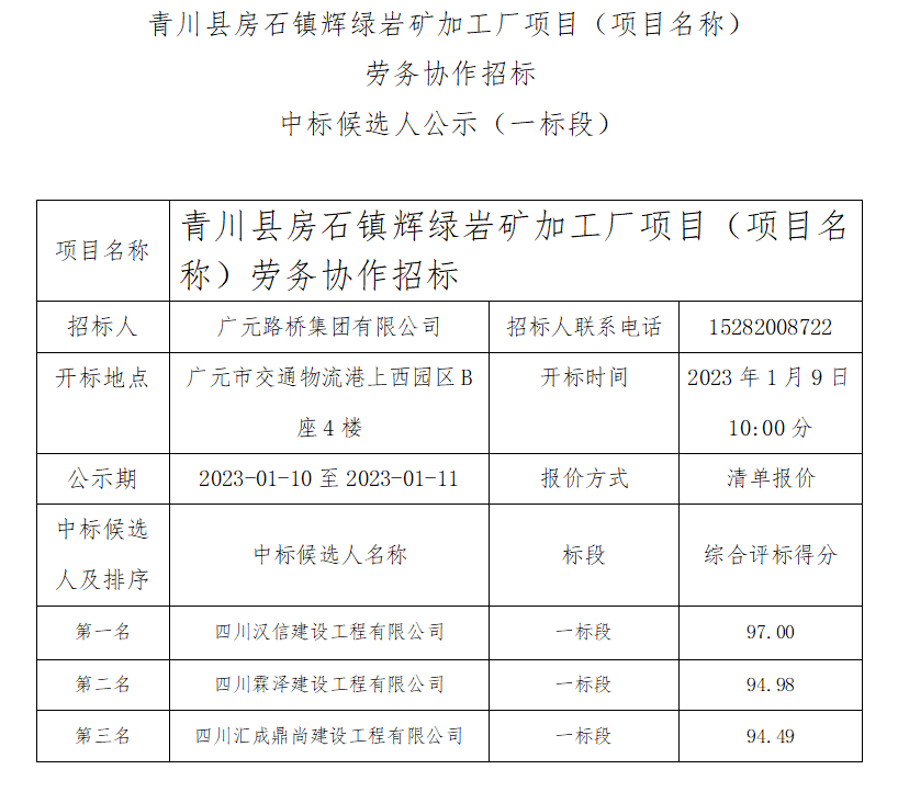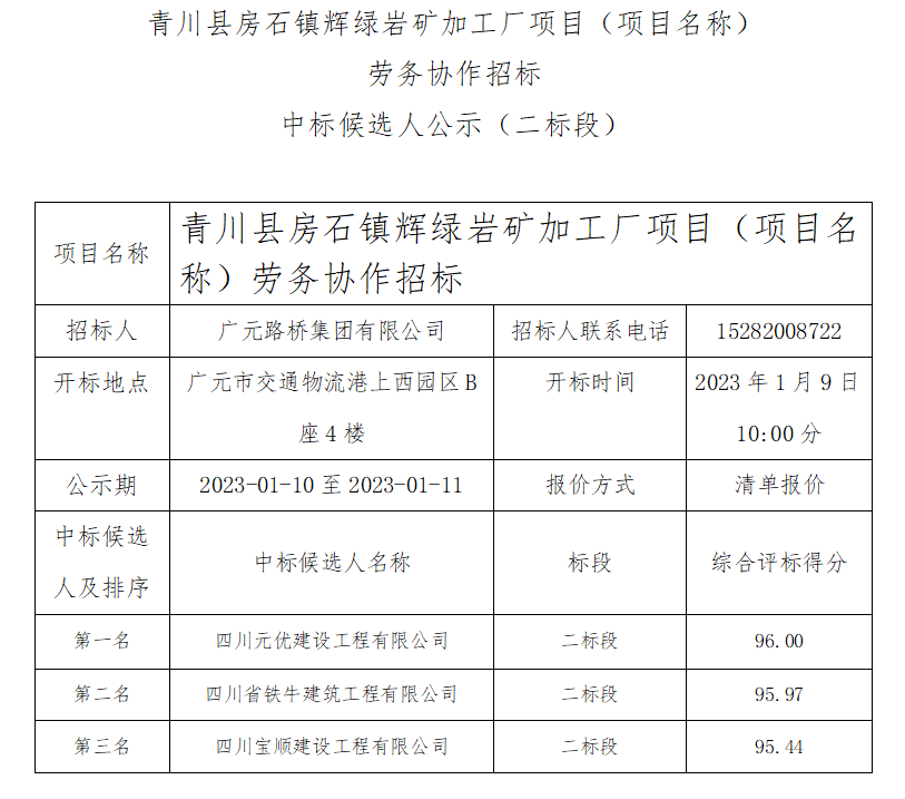 青川县房石镇辉绿岩矿加工厂项目(项目名称) 劳务协作招标中标候选人公示